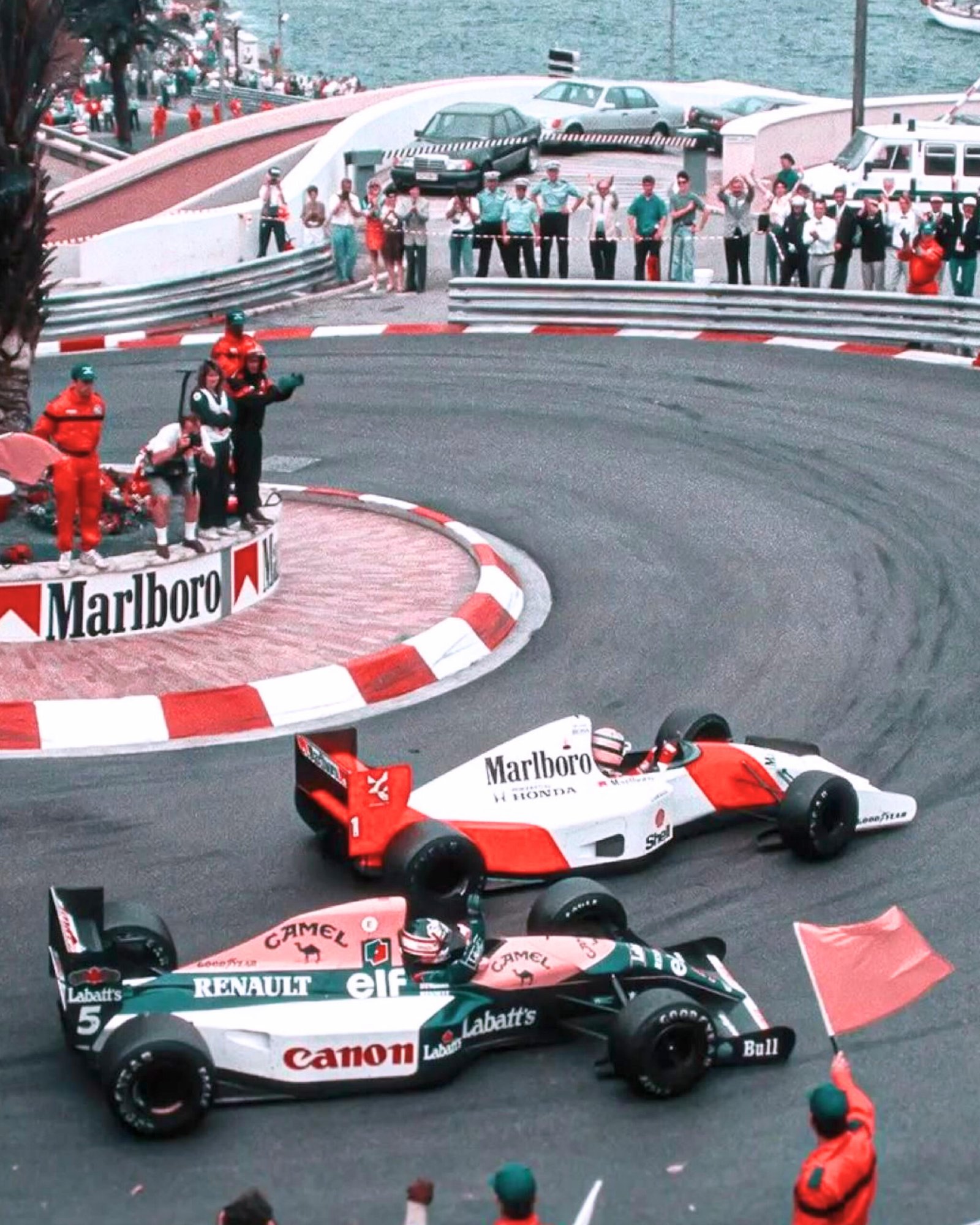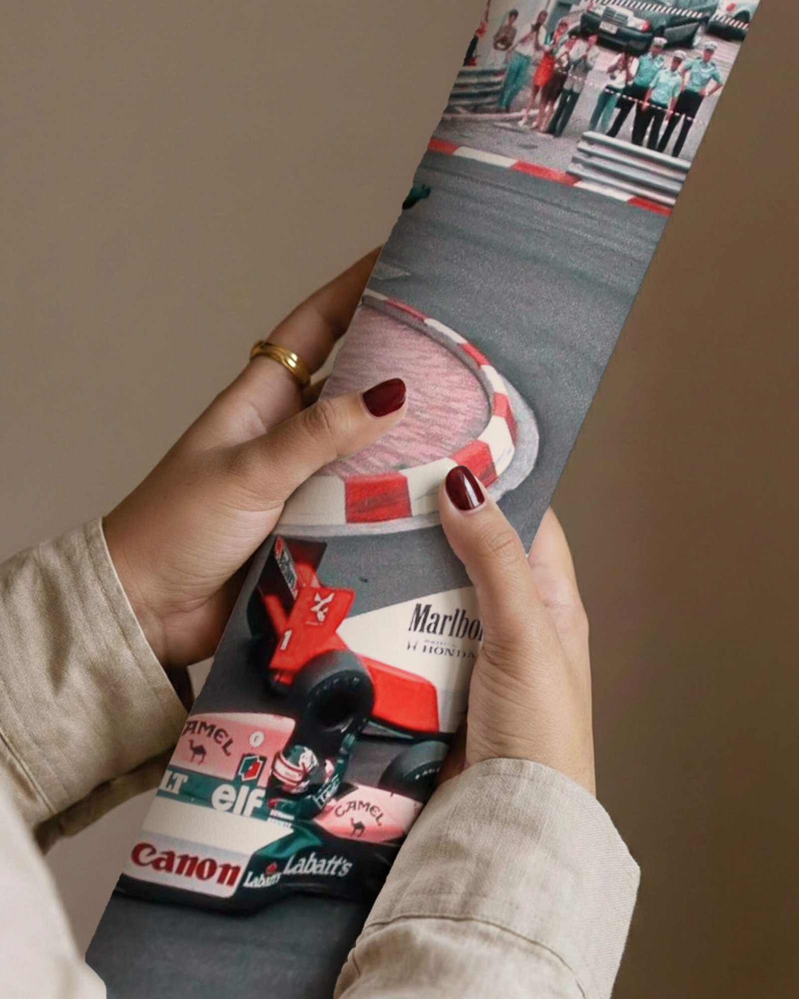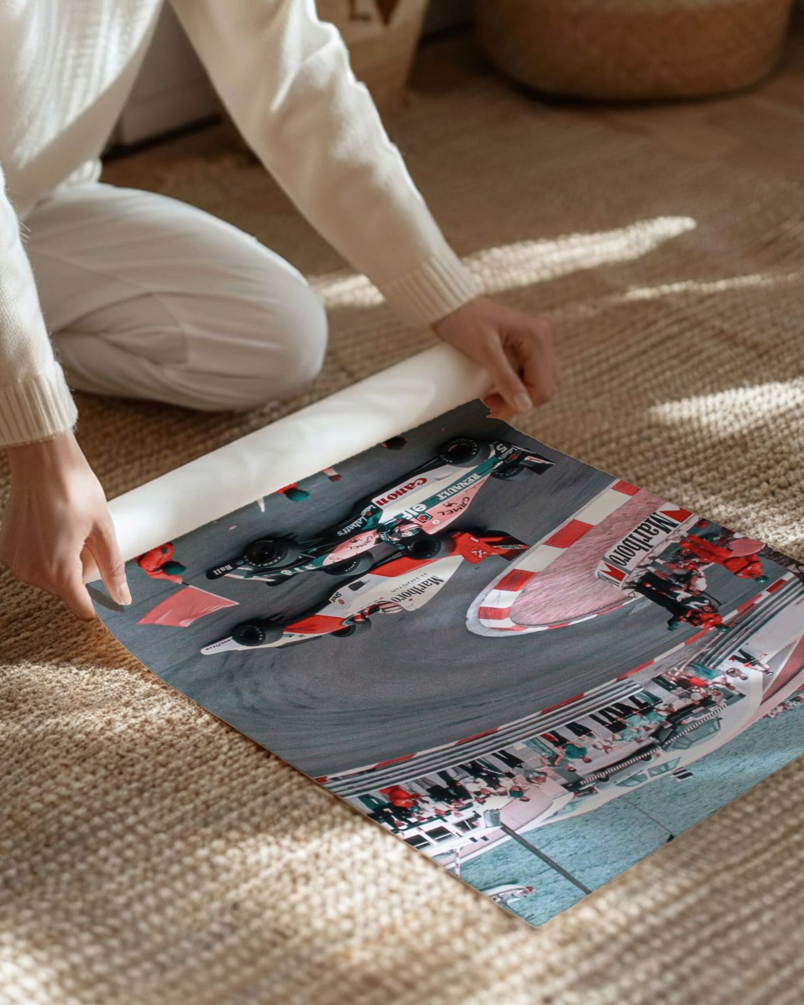 A timeless full colour photograph capturing Ayrton Senna navigating the iconic streets of the Monaco Grand Prix. Museum-quality matte print designed for automotive enthusiasts, collectors, and refined interiors.