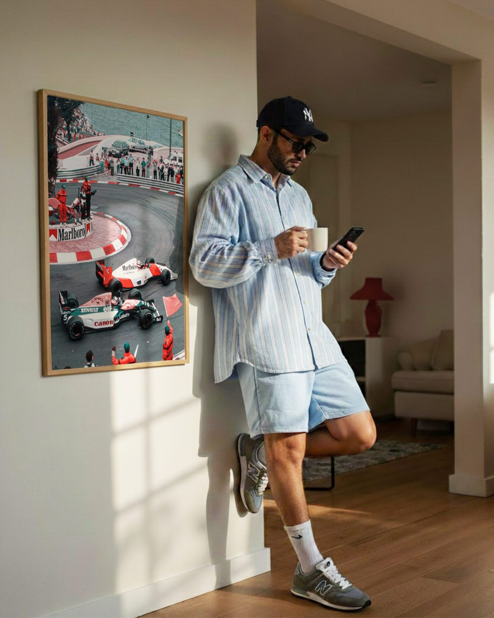 This photograph immortalizes Ayrton Senna in action at the legendary Monaco GP, one of the most iconic moments in Formula 1 history. The black and white composition emphasizes motion, detail, and timeless elegance — reducing the scene to pure design, tension, and form.