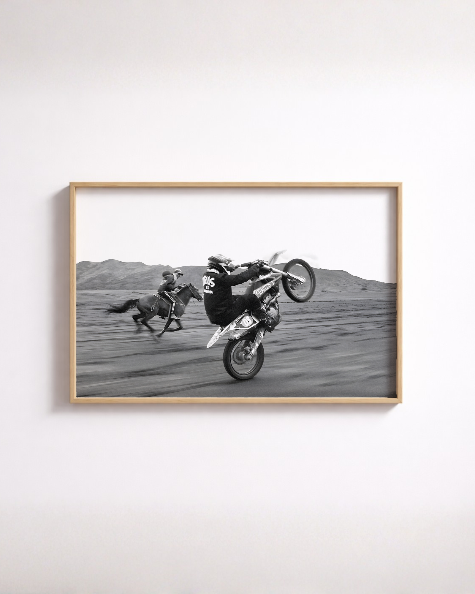 Elevate your space with this Black and White Desert Racing wall art print, designed to bring bold contrast and cinematic energy into modern interiors. Featuring the dynamic motion of a dirt bike and horse against a striking desert landscape, this piece merges adrenaline with timeless monochrome aesthetics.