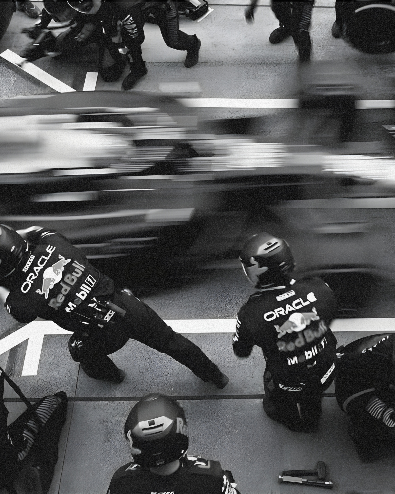 Black and white F1 vintage pit crew photography artwork; minimalist and timeless style; ideal for gallery walls or as a bold focal point