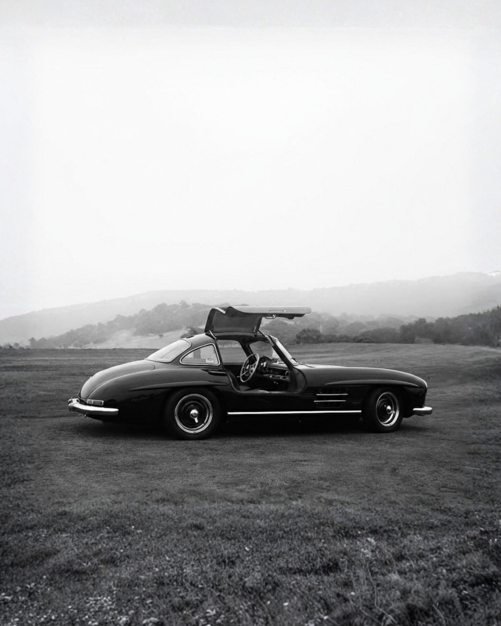 Celebrate one of the most iconic silhouettes in automotive history with this black and white vintage Mercedes 300 SL Gullwing poster 🏁. Captured in timeless monochrome, the legendary upward-opening doors and sculpted body lines are elevated through rich contrast and refined detail.