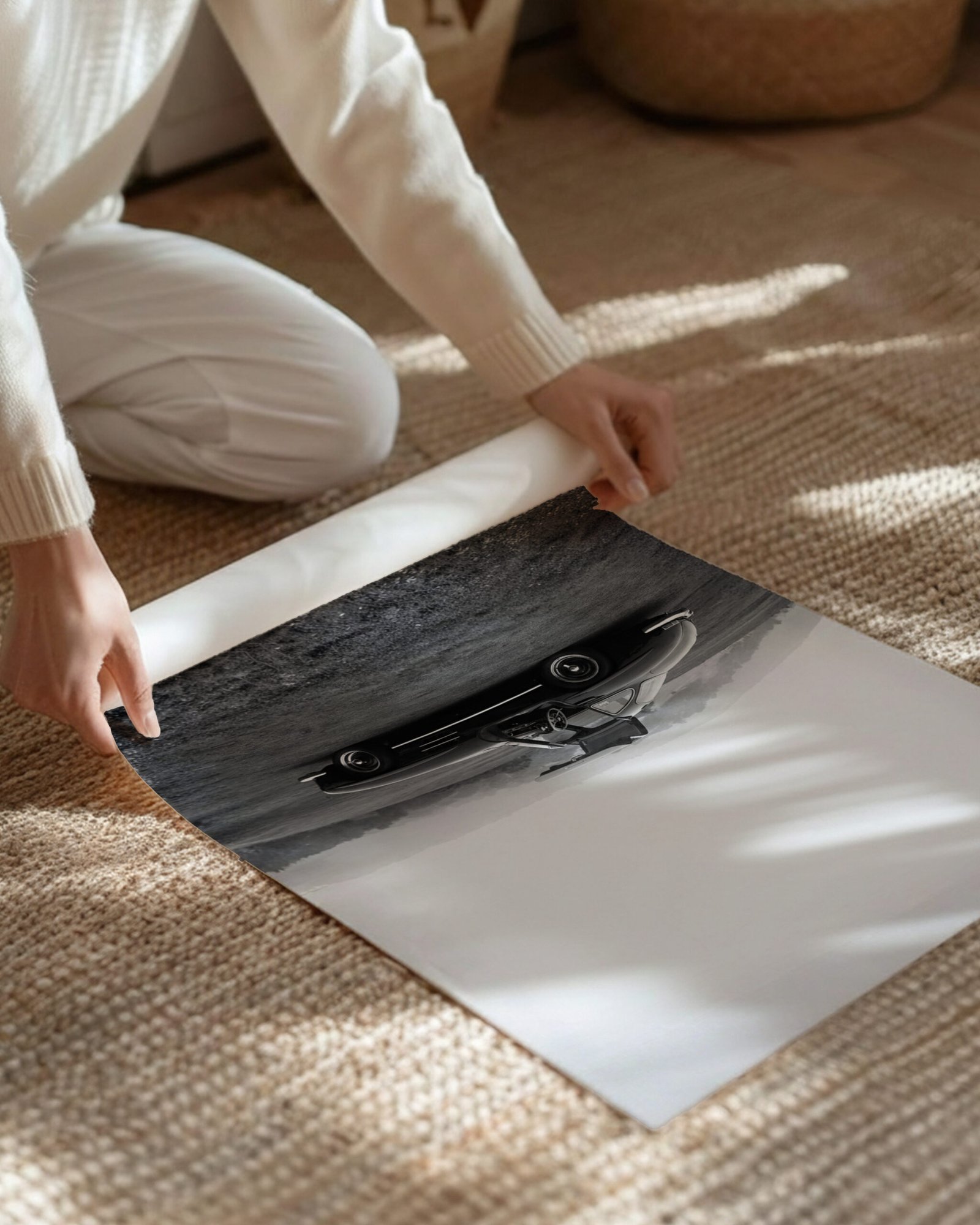 The black and white format enhances chrome accents, flowing curves, and the unmistakable profile that made the 300 SL a design milestone of the 1950s. The result is a piece that feels both nostalgic and modern—honoring classic engineering while fitting seamlessly into contemporary interiors.