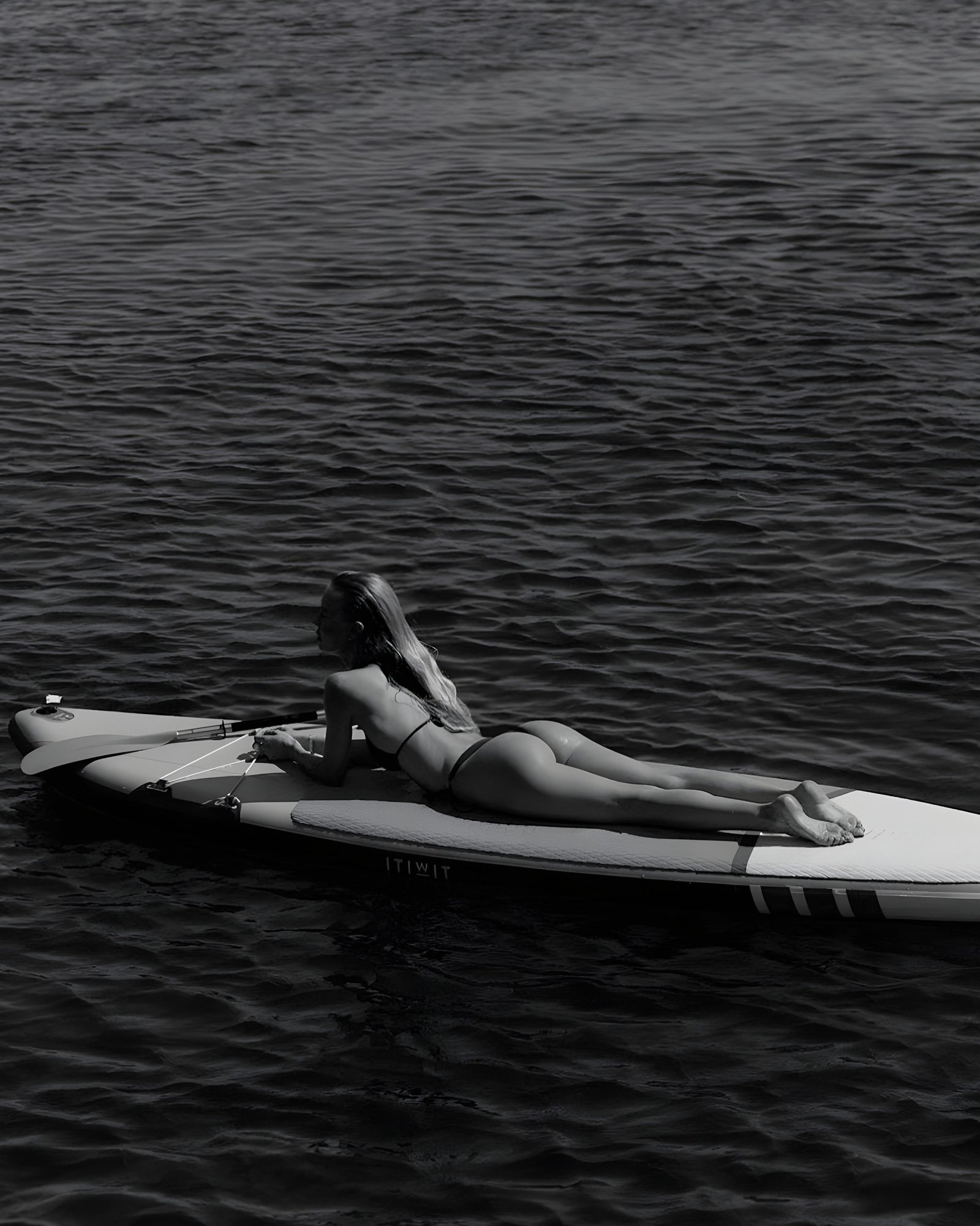 The black-and-white palette sharpens texture: salt against skin, matte fiberglass beneath bare feet, wind lifting strands of hair. There is no chaos in the frame. No crashing wave. No dramatic spray. Only stillness before movement.
