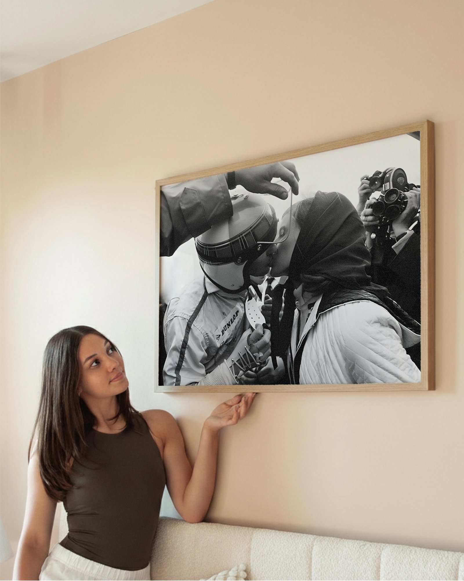 Elevate your space with this Vintage Formula 1 Pit Lane Kiss wall art print, a powerful moment that captures the romance, danger, and human emotion behind motorsport’s most legendary era. This historic image blends cinematic storytelling with timeless composition, making it a striking addition to any refined interior.